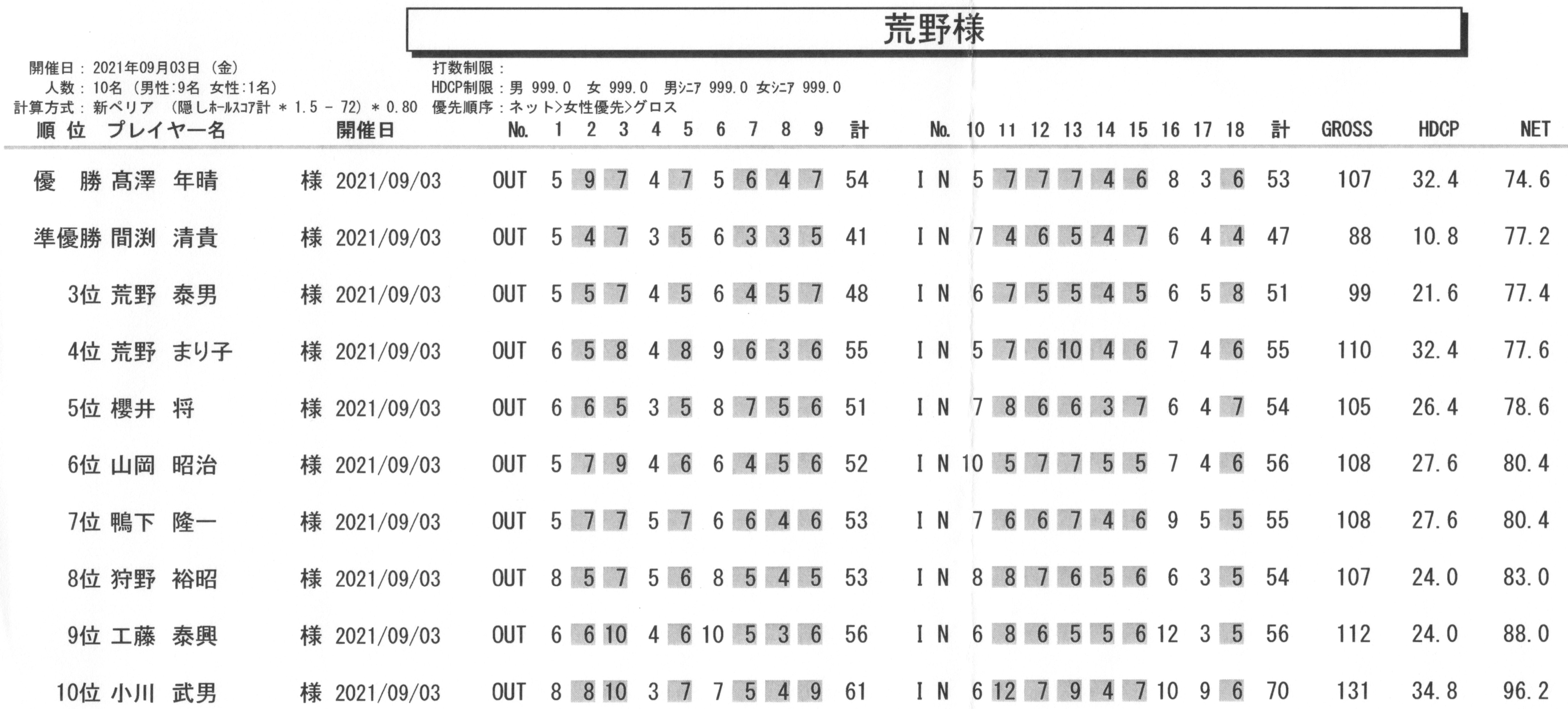 | 20 | 月 | | 敬老の日杯(シニア60歳〜、グランドシニア70歳〜) 競技は中止 シニア 8:40 東 山岡昭治、間渕清貴、千葉千代美 グランドシニア 8:19 西 荒野泰男、長濱正信、馬場正利、中山 博 8:40 西 北村 肇、柳本保武、赤羽 明、 |